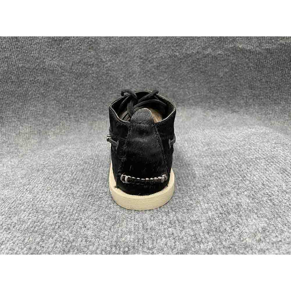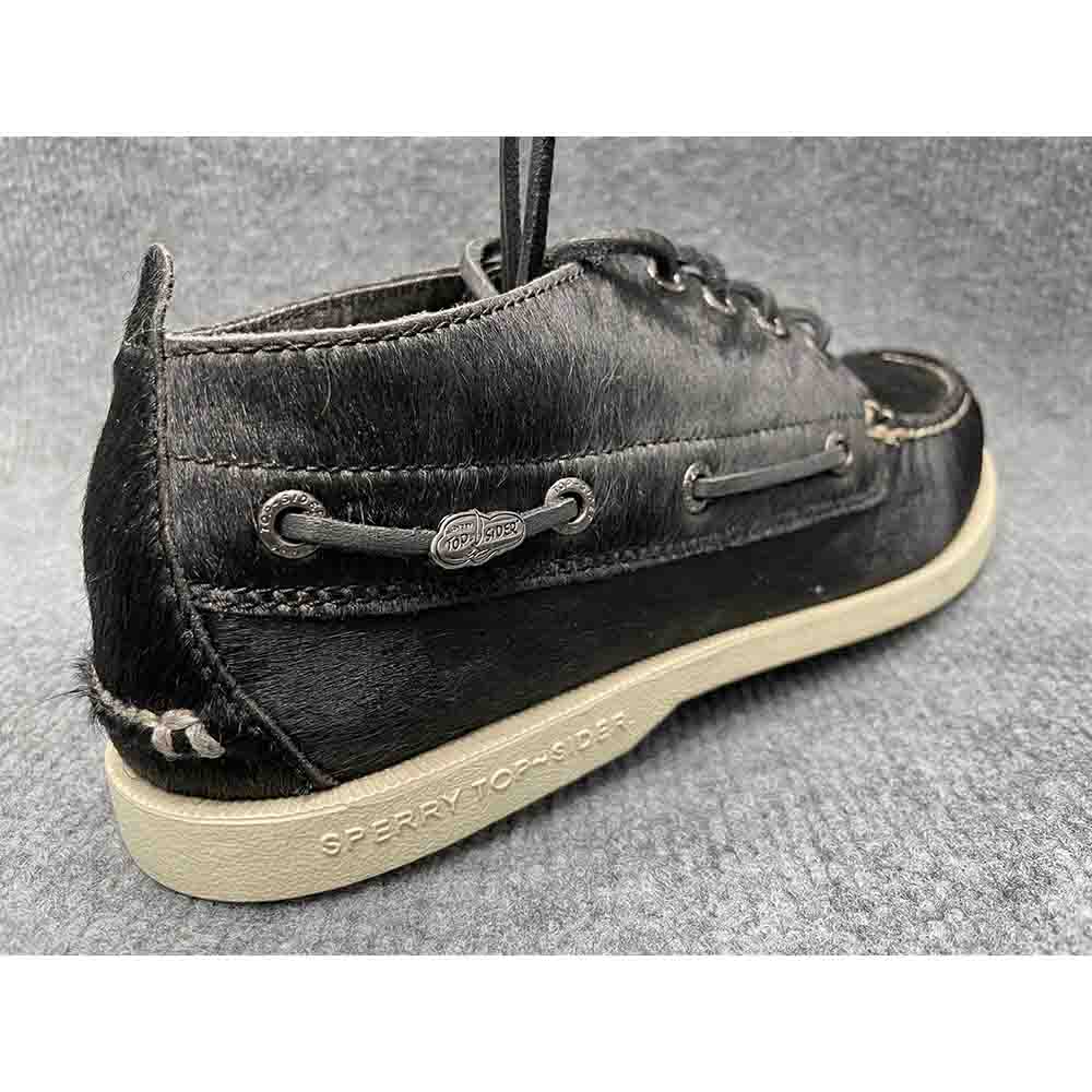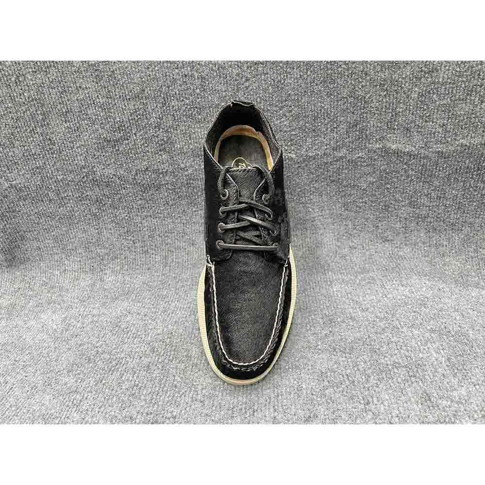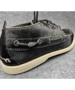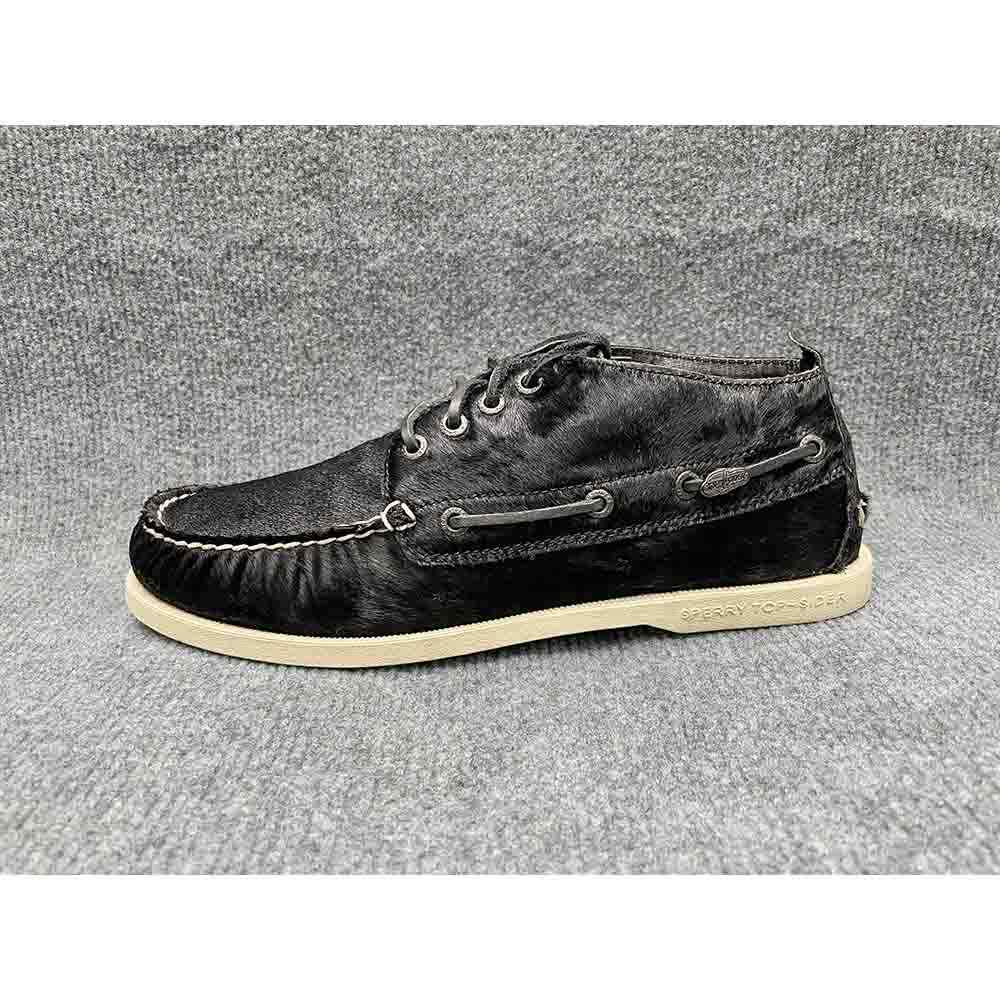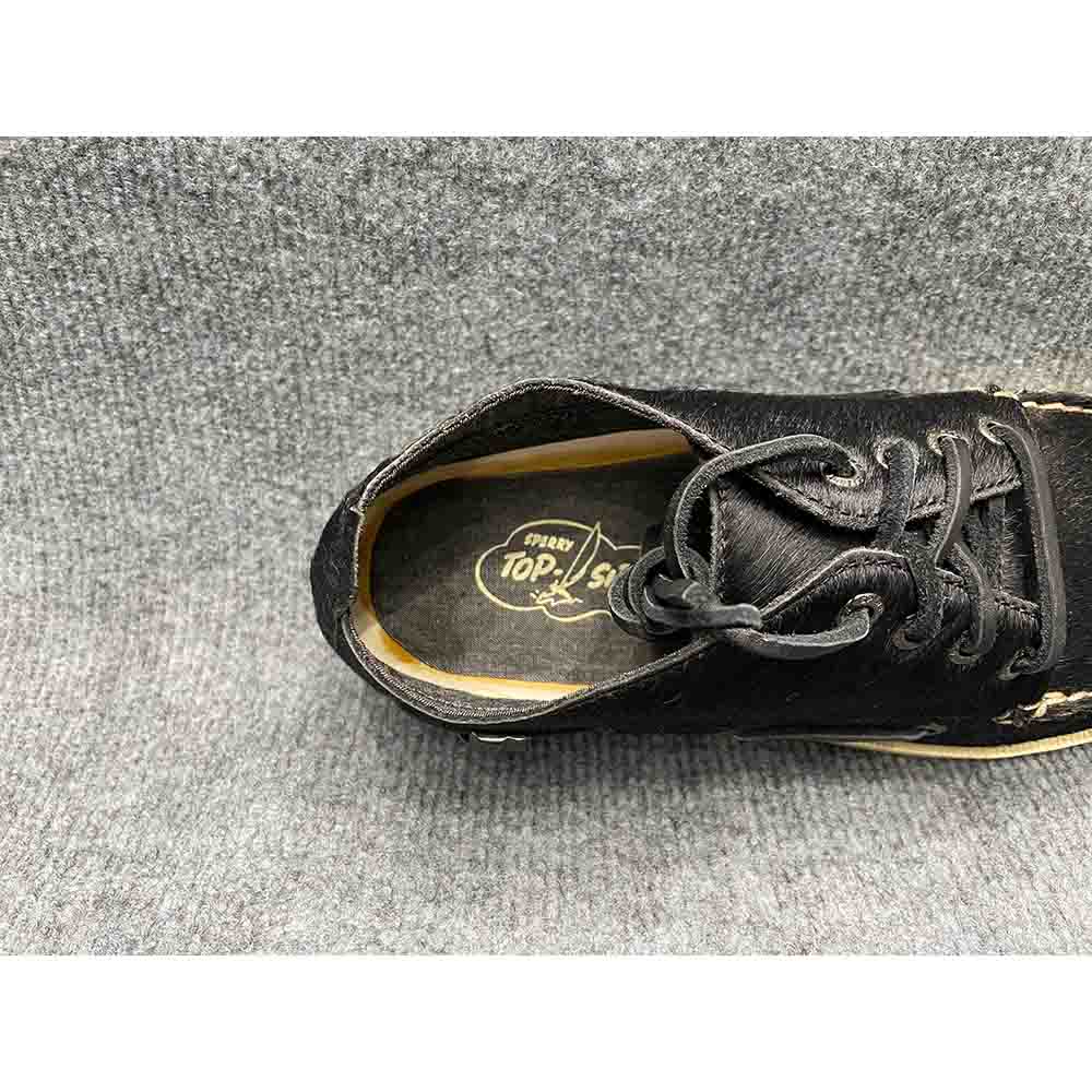 Mẫu giày boat dòng 4 lỗ xỏ dây phiên bản đặc biệt đến từ thương hiệu Sperry. Đặc biệt ở chỗ nó được làm từ Hair On Cowhide – Loại da bò nguyên lông với kỹ thuật thuộc da tài tình giữ nguyên được bộ lông óng mượt, nó mang lại vẻ đẹp độc đáo, nguyên thủy và còn cách nhiệt rất tốt. Điểm nhấn trên thân giày chính là đường chỉ khâu màu và đế giày màu trắng, tạo độ tương phản với thân giày màu đen. Lớp lót phía trong được lót bằng vải cotton mềm, xốp mang lại cảm giác dễ chịu với da chân. Đế giày cao su đặc đúc đặc trưng của Sperry với các vân gợn sóng giúp tăng cường ma sát, đế được khâu gầm 360 độ chắc chắn.