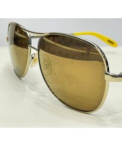 Gọng kính bằng kim loại cao cấp, màu vàng ánh kim, đem lại cảm giác chắc chắn và sang trọng. Tròng kính bằng polycarbonate giúp giảm trọng lượng, bền bỉ và chống trầy xước tốt.